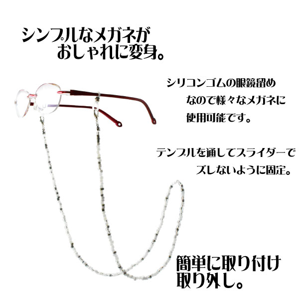 メガネチェーンの先端はシリコンゴムなので様々なサイズのテンプルに合わせて お使いいただけます。