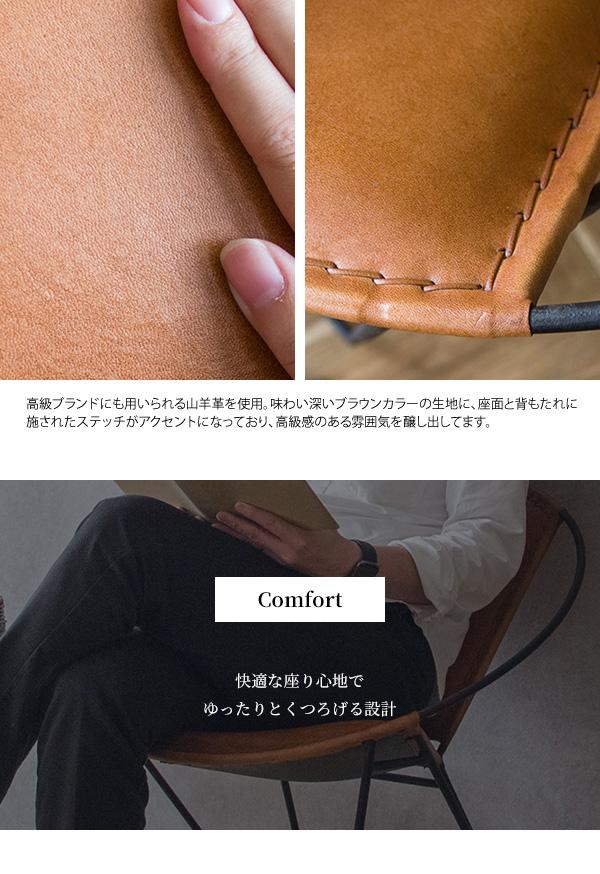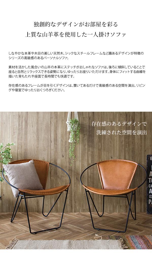 マルチに活躍してくれる北欧風パーソナルソファ 日本人サイズでしっかりとした座面部分は安定感も抜群です。 置くだけでお部屋をオシャレに飾ってくれるデザインチェアです。 幾何学的でしなやかなスチールフレームデザインが特徴の高級感のあるパーソナルソファ。 素材を活かした風合いの山羊の本革にステッチがおしゃれなソファは、後ろに傾斜していることで座ると自然とリラックスできる姿勢になり、ゆったりお座りいただけます。 身体にフィットする曲線を描いた背もたれや座面で長時間でも快適です。 存在感のあるフレームが目を引くデザインは、置いてあるだけで高級感のある空間を演出。リビングや寝室でゆったりおくつろぎください。 完成品でのおとどけです。