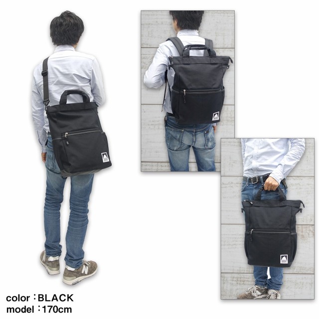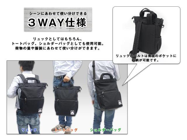 トートバッグやショルダーバッグとしても使用できる3WAYになっています。トートバッグ、ショルダーバッグとして使用する際はリュックのベルトは背面のポケットに収納しておけます。