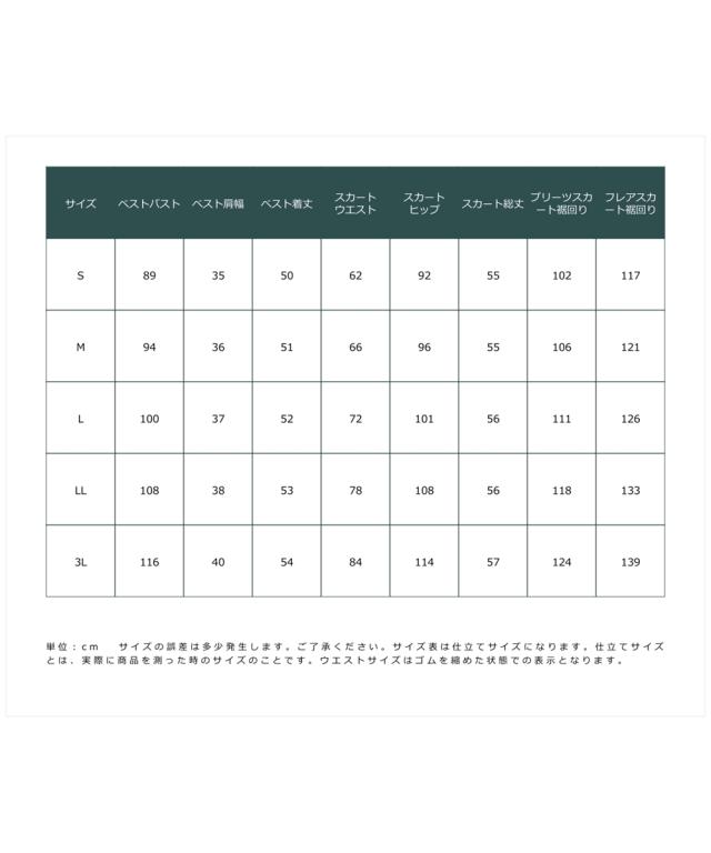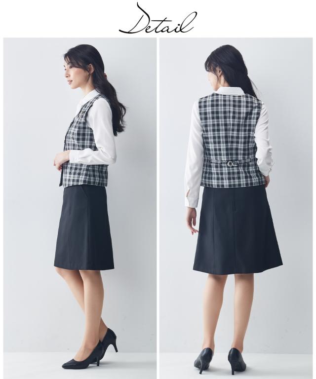 品質=[表地]黒・黒白チェック:ポリエステル100% ストライプ:ポリエステル98%・レーヨン2% 裏地有(ベスト・2スカート:総裏) ベスト:前ボタン開 ポケット左胸・前2 スカート:ウエスト後脇ゴム入・前滑り止めテープ付 後ホック・ファスナー開 ポケット両脇 ※この商品はベスト・タックプリーツスカート・セミフレアスカートの3点同サイズでのみ販売します。※ベストはLLサイズから5面体仕様です。 ウエストサイズはゴムを縮めた状態での表示となります。 原産国:中国製 洗濯表示:洗濯機OK ネット使用