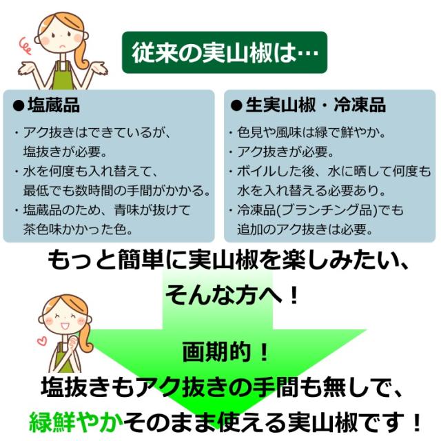 収穫したての実山椒を、鮮度そのままにしっかりアク抜きた水煮パックです。
