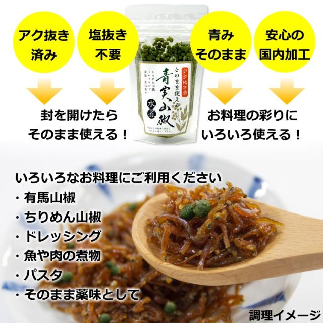 アク抜き・塩抜きなどの下処理が不要ですので、開封・水を切ればそのままお料理へ。山椒独特の爽やかな香りと辛さはもちろん、鮮やかな緑色がお料理を引き立てます。煮物や冷奴などの薬味としてだけでなく、ちりめん山椒や佃煮などとしても、ご飯のおともとして外せない一品になります。 // 国内加工品 アク抜き済み 山椒の実 ちりめん山椒 ドレッシング 薬味 まとめ買い