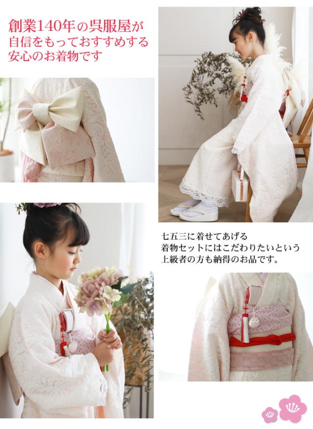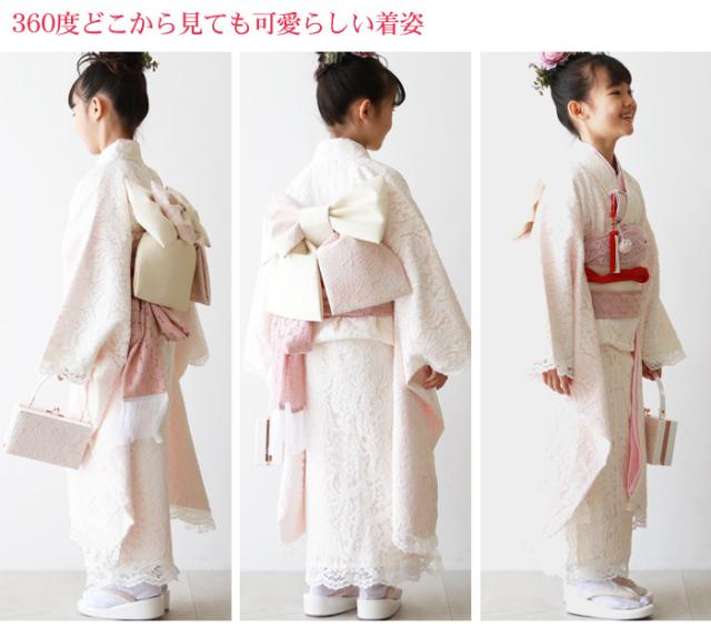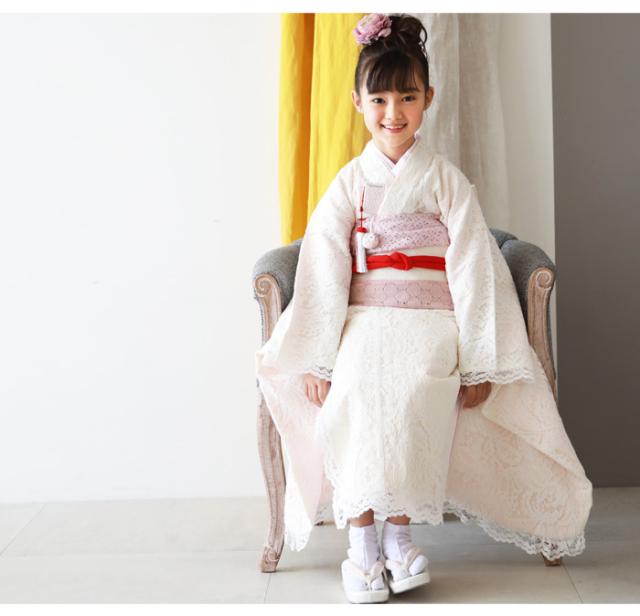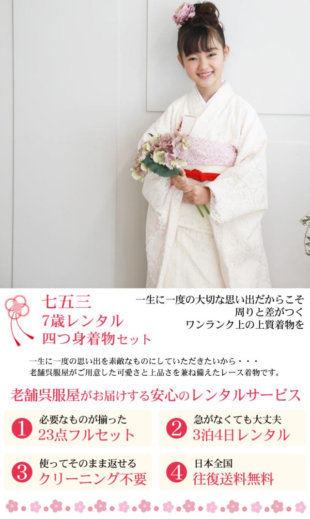 【レンタル】七五三 着物 7歳 レンタルフルセット 四つ身着物23点セットレンタル「オフホワイト・白のレース着物」白レース着物 女の子 ひな祭り 雛祭り 衣裳 お正月 結婚式 発表会 晴れ着 モダン おしゃれ かわいい〔消費税込み〕