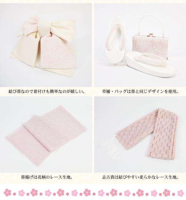 | ※髪飾りはセットに含まれておりません。 ※肩上げ・腰上げはされていません。 ※モデル着用の半衿・長襦袢・着付け小物類の色、デザインはイメージです。 ※帯・草履・帯締め・帯揚げ・志古貴・筥迫・扇子は品質も安心の日本製です。 ※商品画像はお客様のモニター環境等により、実際のカラーと若干異なって見える場合がございます。 ※レース生地は引っかけなどに弱いので、お取り扱いにはご注意ください。 | |||