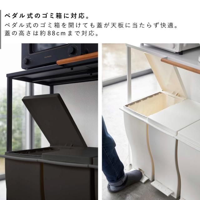 1〜3個のゴミ箱を置くことができ、ペダル式のゴミ箱を開けても蓋が天板に当たらない高さです。(蓋の高さ約88cmまでOK)