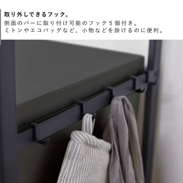 側面のバーに取り付け可能のフック5個付き。ミトンやエコバッグなど、小物などを掛けるのに便利。