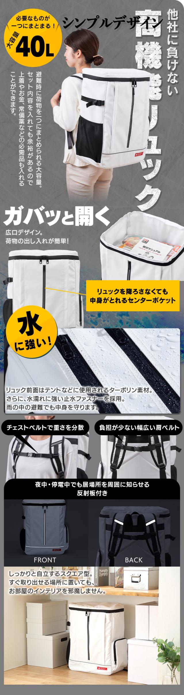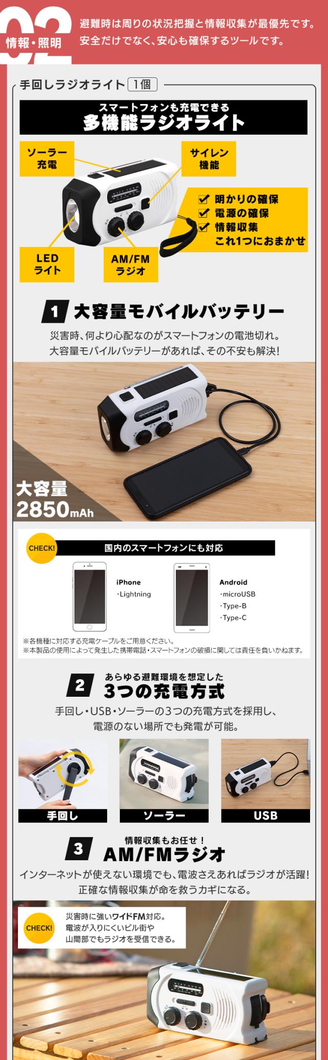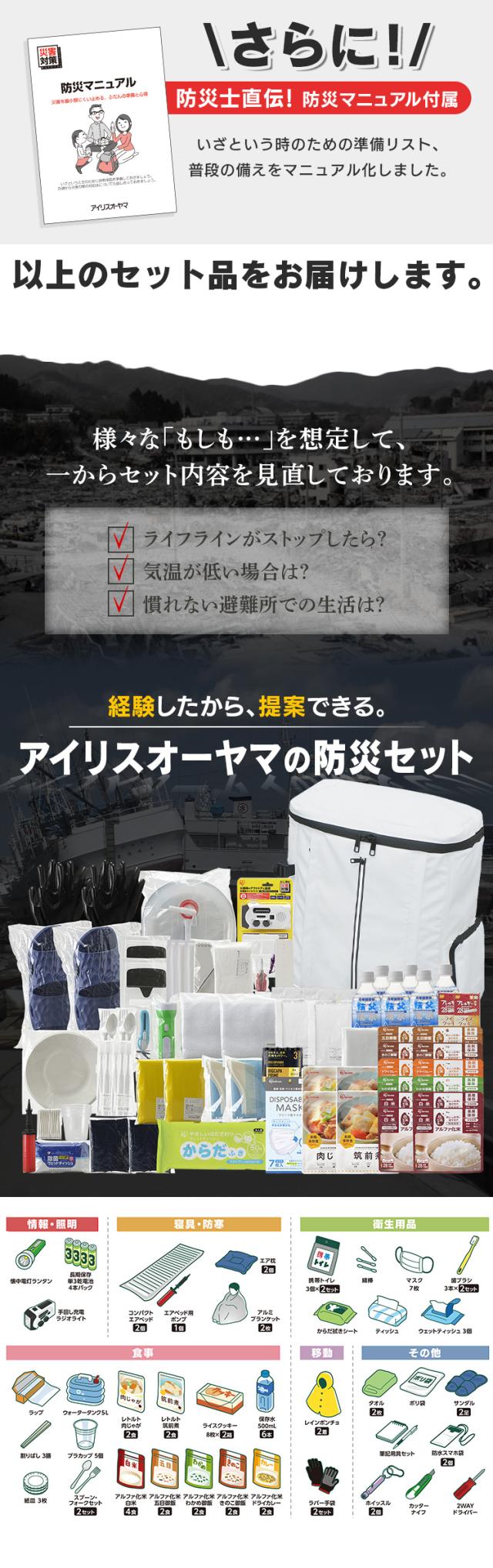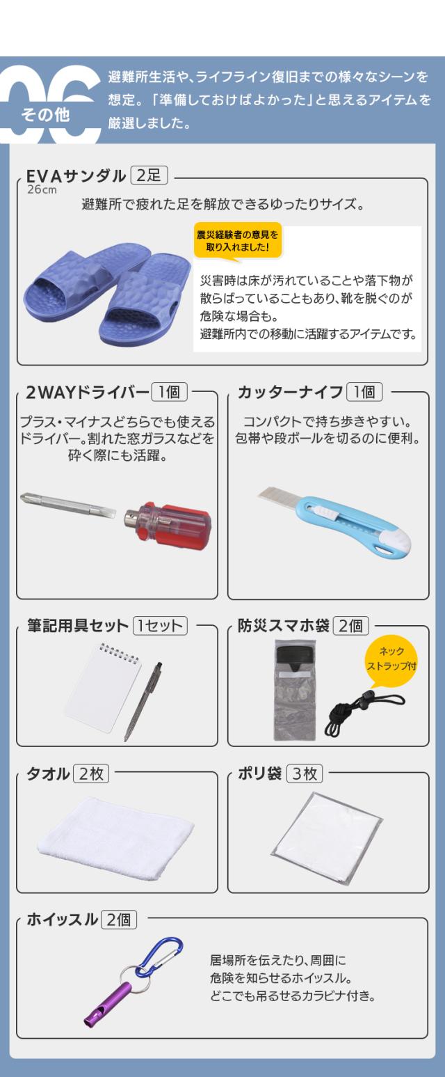 懐中電灯ランタン(単3形乾電池2本・別売り)、長期保存単3形乾電池4本パック、手回し充電ラジオライト、コンパクトエアベッド2セット、エアベッド用ポンプ、エア枕2個、アルミブランケット2枚、携帯用トイレ3個2セット、綿棒20本、マスク7枚入り、歯ブラシ3本2セット、からだ拭きシート、ティッシュペーパー、ウェットティッシュ10枚入り3個、ラップ、ウォータータンク5L、割りばし3膳、プラカップ5個、紙皿3枚、スプーン・フォークセット2セット、レトルト食品(肉じゃが・筑前煮各2食)、ライスクッキー8枚入り2箱、保存水500mL6本、アルファ化米(白米4食、五目御飯・わかめ御飯・きのこ御飯・ドライカレー各2食)、レインポンチョ2着、ラバー手袋2セット、タオル2枚、ポリ袋、EVAサンダル(26cm)2足、筆記用具セット、防水スマホ袋2個、ホイッスル2個、カッターナイフ、2WAYドライバー