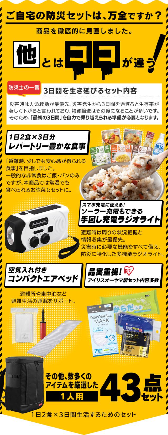 食品付きの1人用43点入りセット、防災マニュアル付きです。