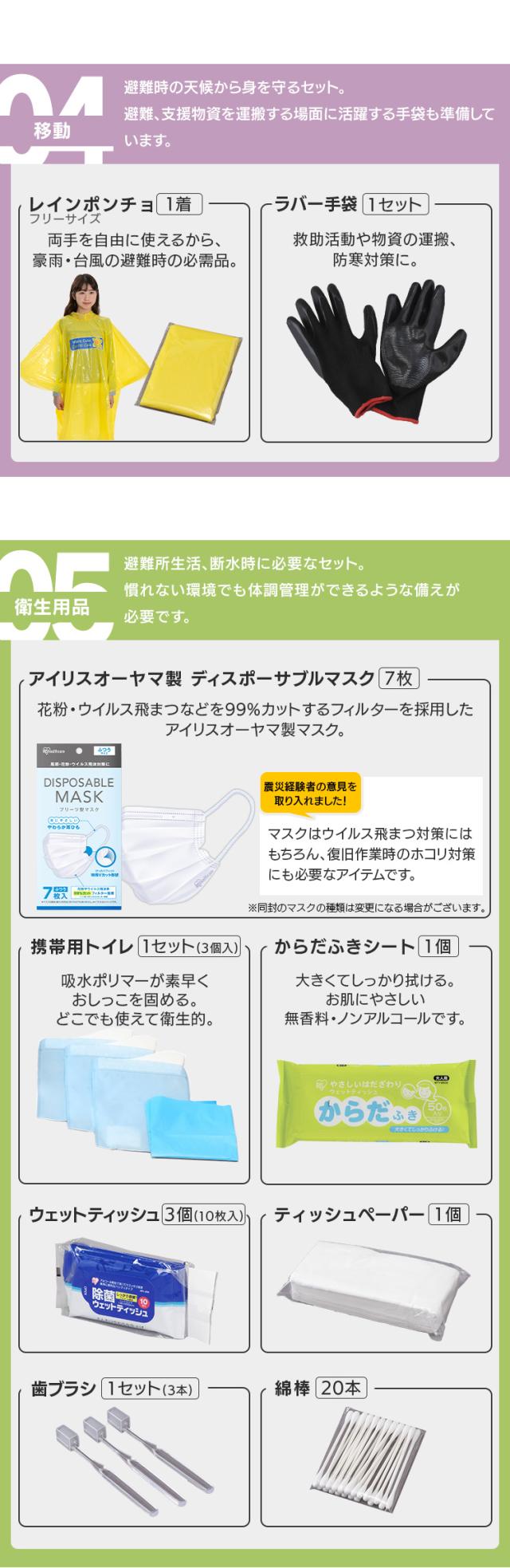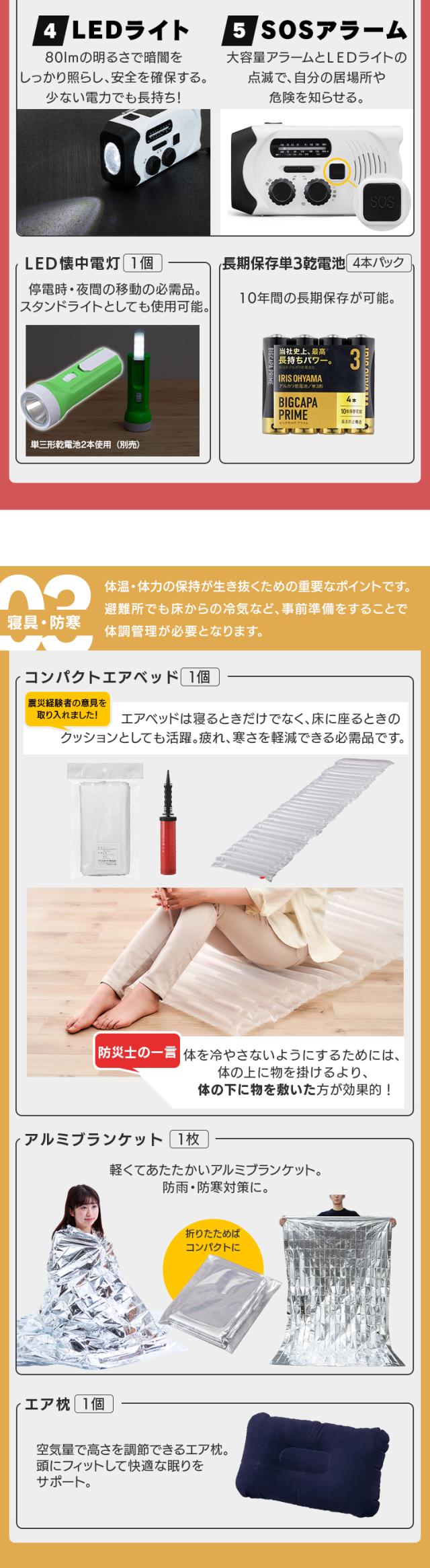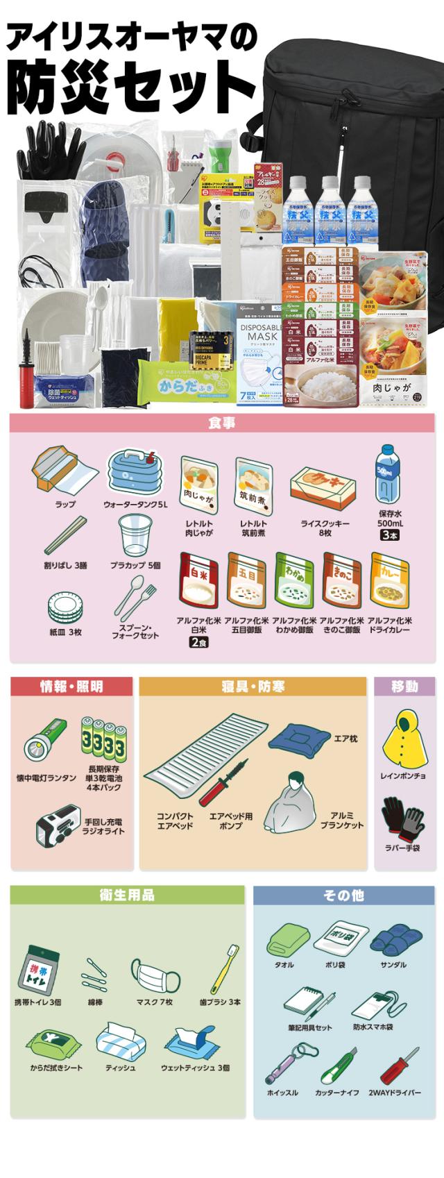 懐中電灯ランタン(単3形乾電池2本・別売り)、長期保存単3形乾電池4本パック、手回し充電ラジオライト、コンパクトエアベッド、エアベッド用ポンプ、エア枕、アルミブランケット、携帯用トイレ3個、綿棒20本、マスク7枚入り、歯ブラシ3本、からだ拭きシート、ティッシュペーパー、ウェットティッシュ10枚入り3個、ラップ、ウォータータンク5L、割りばし3膳、プラカップ5個、紙皿3枚、スプーン・フォークセット、レトルト食品(肉じゃが・筑前煮各1食)、ライスクッキー8枚入り、保存水500mL3本、アルファ化米(白米2食、五目御飯・わかめ御飯・きのこ御飯・ドライカレー各1食)、レインポンチョ、ラバー手袋、タオル、ポリ袋、EVAサンダル(26cm)、筆記用具セット、防水スマホ袋、ホイッスル、カッターナイフ、2WAYドライバー