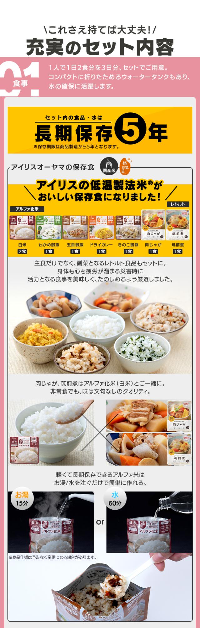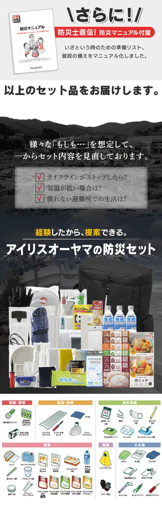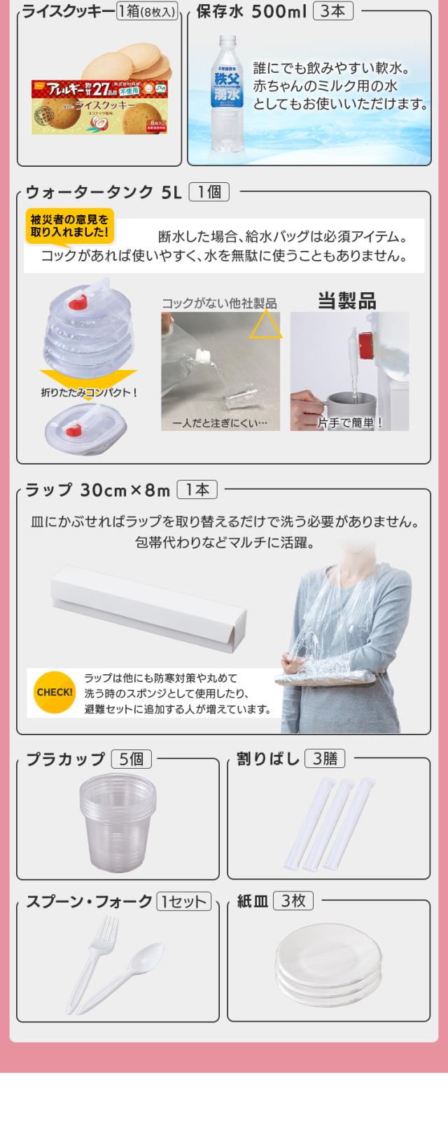懐中電灯ランタン(単3形乾電池2本・別売り)、長期保存単3形乾電池4本パック、手回し充電ラジオライト、コンパクトエアベッド、エアベッド用ポンプ、エア枕、アルミブランケット、携帯用トイレ3個、綿棒20本、マスク7枚入り、歯ブラシ3本、からだ拭きシート、ティッシュペーパー、ウェットティッシュ10枚入り3個、ラップ、ウォータータンク5L、割りばし3膳、プラカップ5個、紙皿3枚、スプーン・フォークセット、レトルト食品(肉じゃが・筑前煮各1食)、ライスクッキー8枚入り、保存水500mL3本、アルファ化米(白米2食、五目御飯・わかめ御飯・きのこ御飯・ドライカレー各1食)、レインポンチョ、ラバー手袋、タオル、ポリ袋、EVAサンダル(26cm)、筆記用具セット、防水スマホ袋、ホイッスル、カッターナイフ、2WAYドライバー