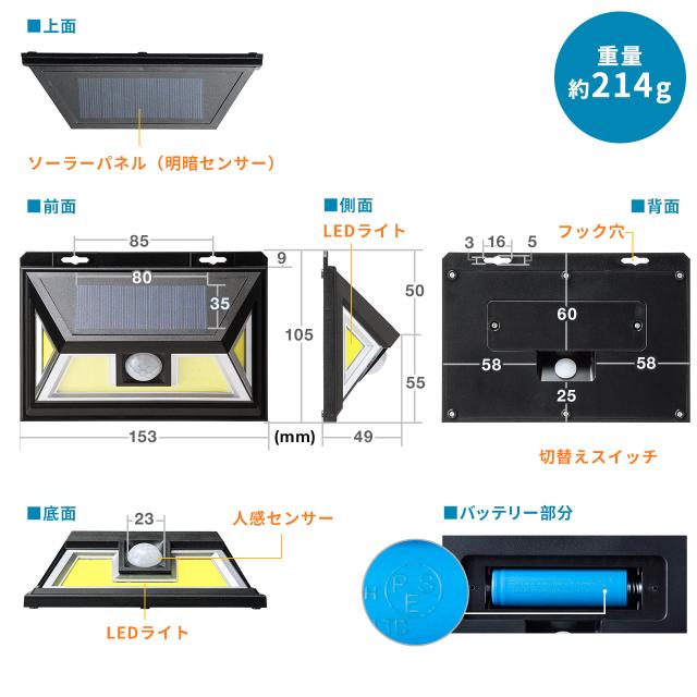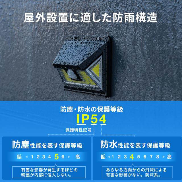 人感 LEDセンサーライト ソーラー充電式 屋外用 壁設置 防水防塵 IP54 300ルーメン LEDライト[800-LED036]