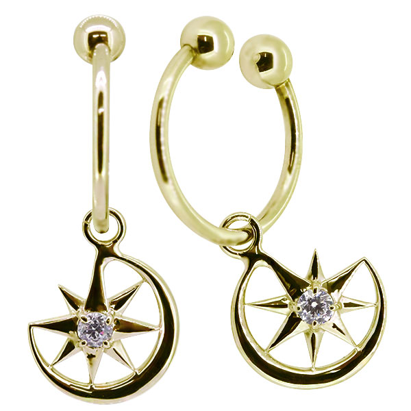 フープイヤリング k18 ノンホールピアス 揺れる 三日月 星 ダイヤモンド イヤーカフ レディース 痛くない 18k 両耳用 母の日