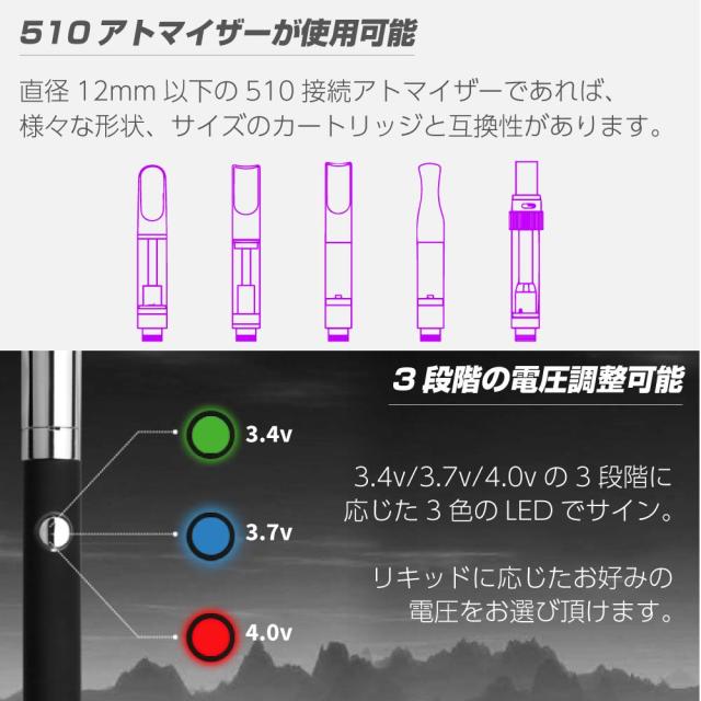 CBDカートリッジユーザーからも人気のAiristech社製で、510 規格の各種カートリッジを接続してご利用頂けます。