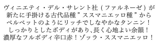 ヴィニエティ・デル・サレント社(ファルネーゼ)が新たに手掛ける古代品種 ススマニエッロ種からベルベットのようにリッチでしなやかなタンニン!しっかりとしたボディがあり、長く心地よい余韻!濃厚なフルボディ辛口赤!ゾッラ・ススマニエッロ!