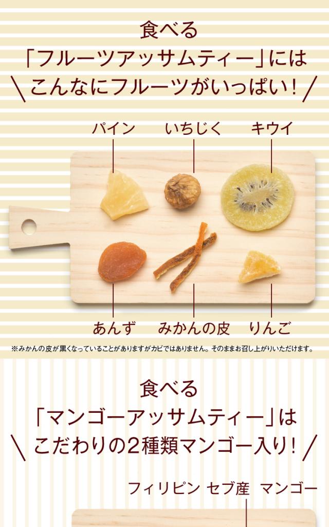 あんず(トルコ産)/パイン(タイ産)/キウイ(タイ産)/いちご(タイ産)/りんご(中国産)/いちじく(イラン産)/みかんの皮(中国産)/アッサム紅茶(インド産)/砂糖/パイン果汁/酸味料/保存料(亜硫酸塩)/着色料(赤40)/香料