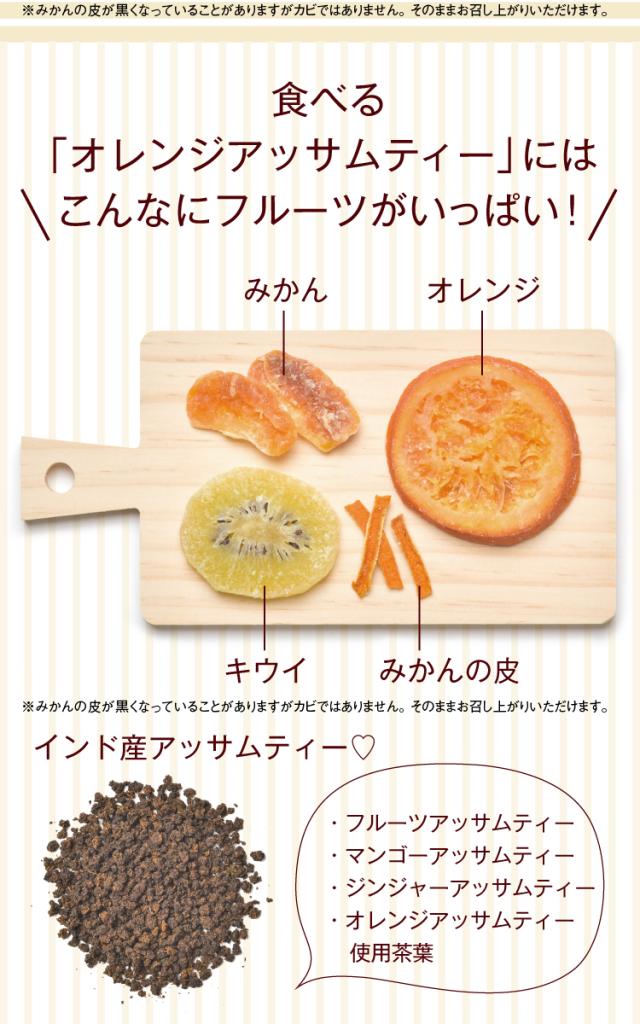 オレンジ(タイ産)/みかん(タイ産)/キウイ(タイ産)/みかんの皮(中国産)/アッサム紅茶(インド産)/砂糖/酸味料/保存料(亜硫酸塩)/着色料(黄5)/香料