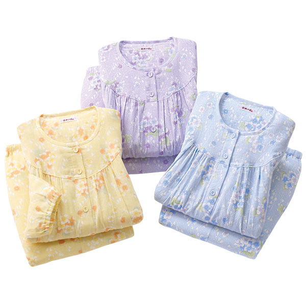 古くから染めの産地である京都洛北友禅ならではの、繊細で美しい色合いのパジャマです。ソフトで通気性のよい綿100%の2重ガーゼ素材を使用。安心の日本製で快適な着心地です。カラーはイエロー・パープル・サックスの3色からお選びいただけます。