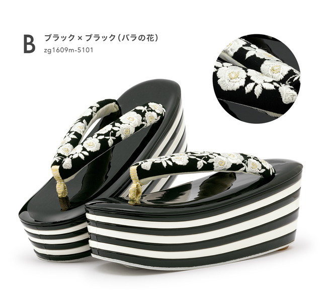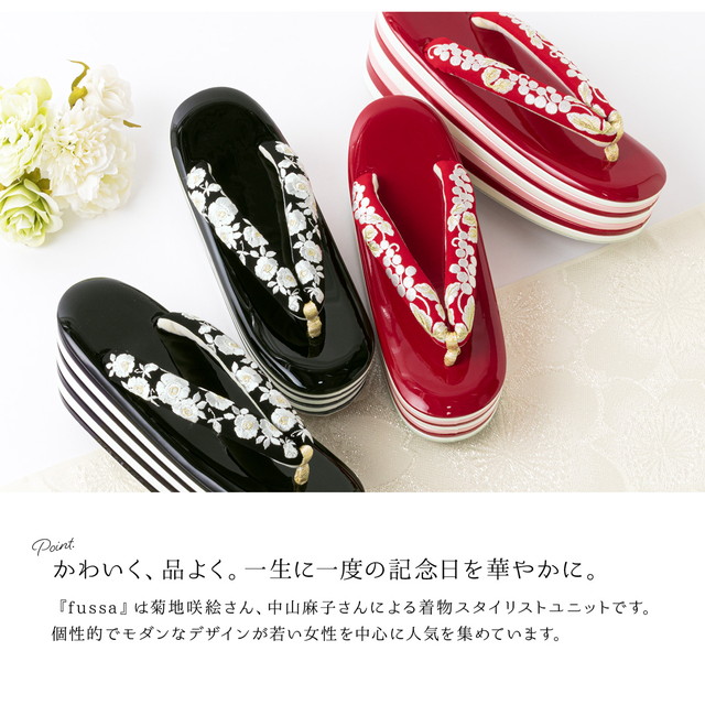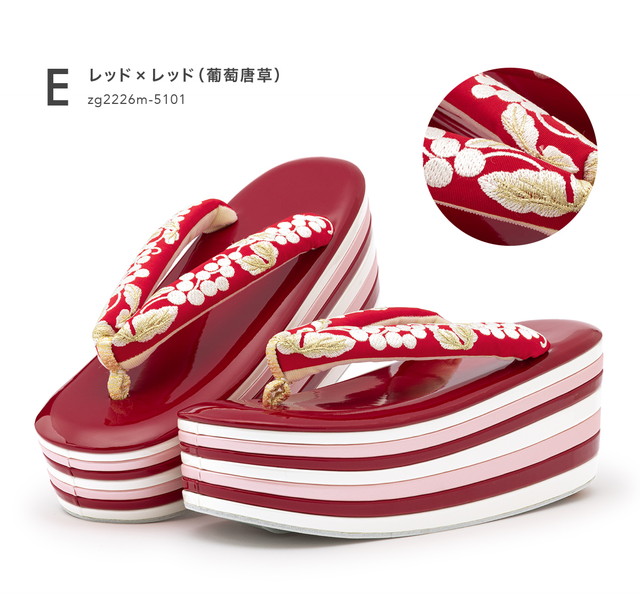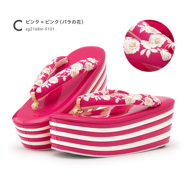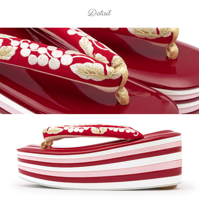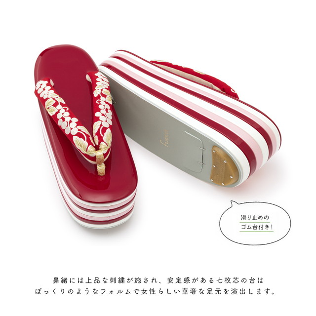 鼻緒には、可憐な薔薇や葡萄唐草の刺繍が施されています。