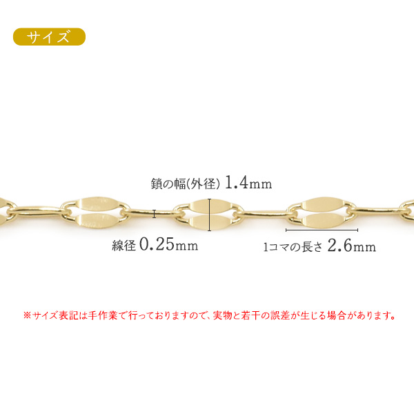 ※オリジナルサイズになる為、ご注文後のサイズ変更やキャンセル、返品交換は一切お受けできません。※代金引換、後払い決済はご利用頂けません。※丸カンを通すには目打ちが必要な場合がございます。※地金の価格変動により、予告なく価格が変更になることがございます。※1cm単位でのご注文になります。商品価格×cm数=商品代金となりますので、ご希望のcm数をご注文ください。 (15cmのチェーンにしたい場合は、数量15個でご注文ください。)※複数本ご購入の場合、お日にちを頂く場合があります。※チェーンのデザイン上、ご希望の長さと多少前後する場合があります。※大量注文の場合は事前にお問い合わせください。