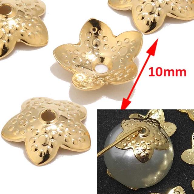 10.0mmの大きさの丸いビーズや真珠パールにフィットするお花型の金メッキしたサージカルステンレス316L製のビーズベイルパーツ。ピアスやネックレスのチャームパーツや、ブレスレットやアンクレットのパーツなど、アクセサリーのデコレーションやDIY、修理などに使えるオシャレな金色のゴールドベイルパーツ。しかも安心で丈夫なステンレス素材なので、高級感もあって低アレルギー、丈夫で長持ちしてくれるのもうれしい男性からも女性からも人気のクラフト部品。自分でアクセサリーを作る人には最適のアイテムです!