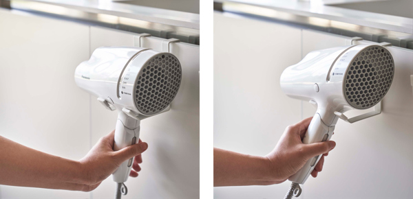 忙しい朝でもサッと取り出し、使った後もすぐ片付けることができます。ハンガー部分にドライヤーを掛けるだけの簡単収納です。
