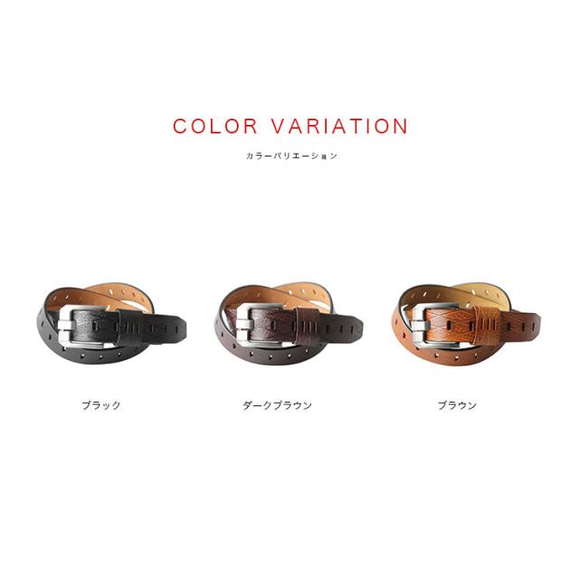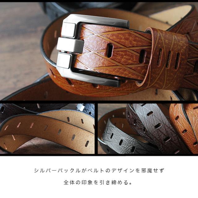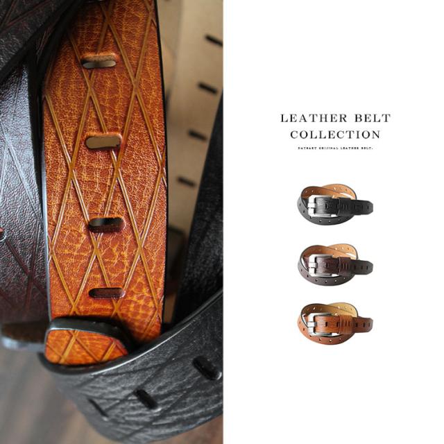 本牛革を使用して製作したレザーベルトです。ダイヤのような格子模様が全体に施されており、ベルト全体に空けられた縦型のベルト穴が個性的なデザインになっています。カジュアルからフォーマルまで対応可能なカラー展開となっています。
