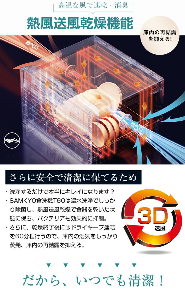 ●SAMKYO食洗機T60は3D熱風乾燥機能を搭載しており、乾燥期間に熱風を庫内に送り込み、食器を乾いた状態に保ち、バクテリアを効果的に抑制できます。
