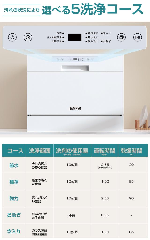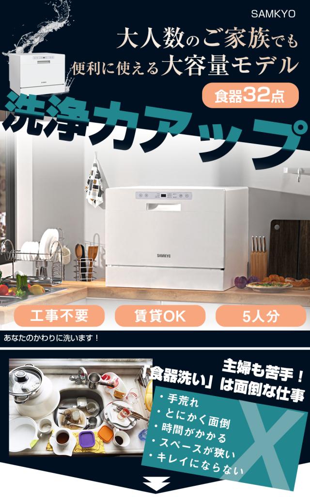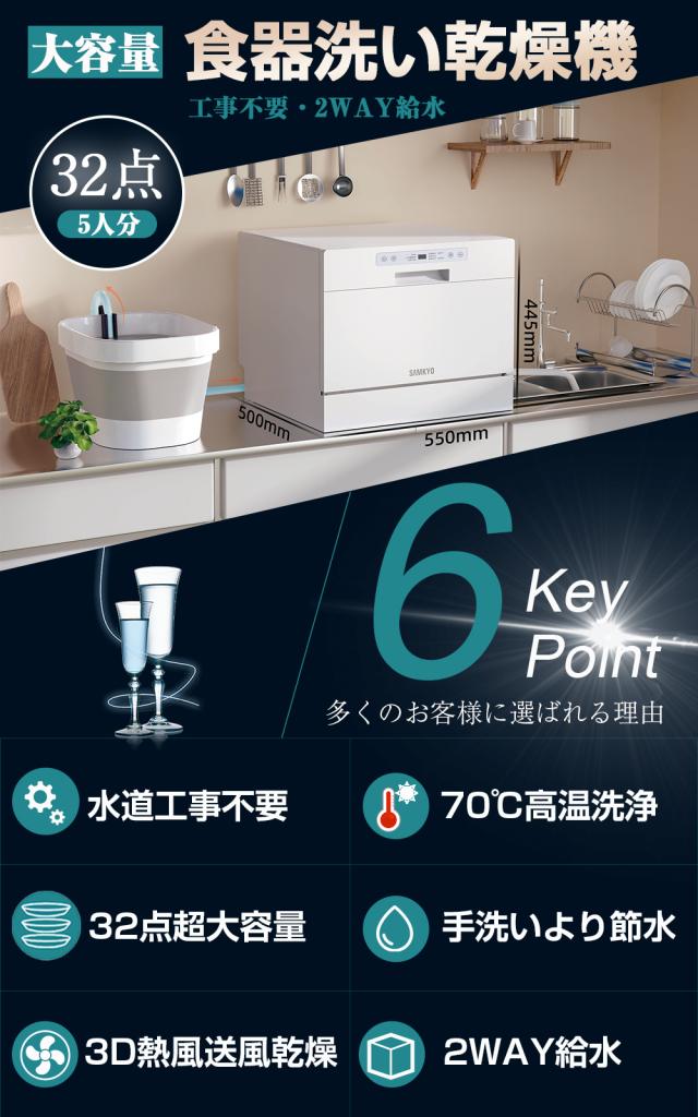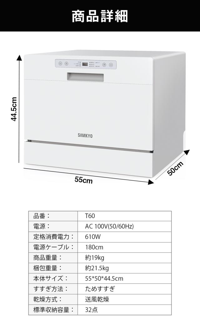 \春の新生活SALE★49800円→39800円!/食洗機 食器洗い乾燥機 SAMKYO食洗機 食洗器 工事不要 大容量 家庭用 5人用 32点大容量 2023モデル 熱風送風乾燥 食洗器 食器洗浄機 折りたたみ給水バケツ付き ホワイト (SAMKYO-T60)