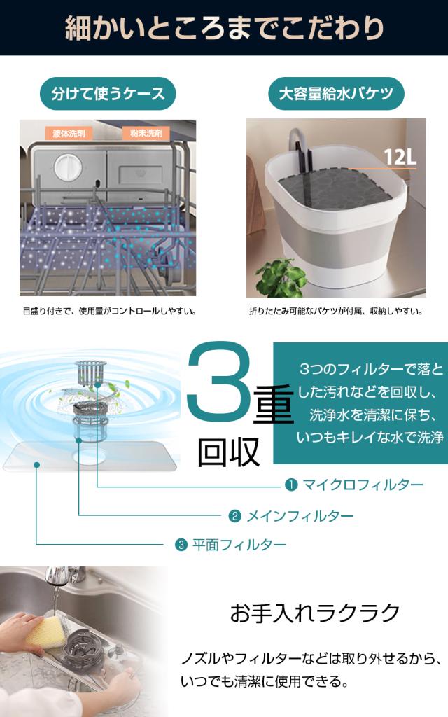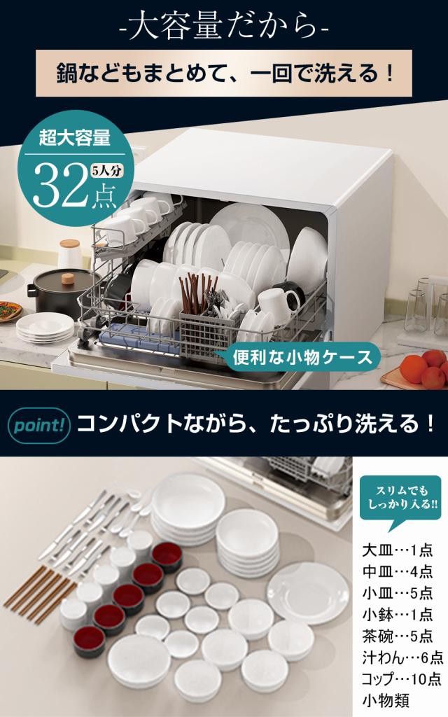 ●お得な大容量サイズ:食器32点(5人分)・最大直径23cmを一度に入られます。5人家族に対応するだけでなく、少人数の家庭や一人暮らしの方なら、1日分の食器を溜めて一気に洗ったり、フライパンやまな板を入れる可能性もあります。