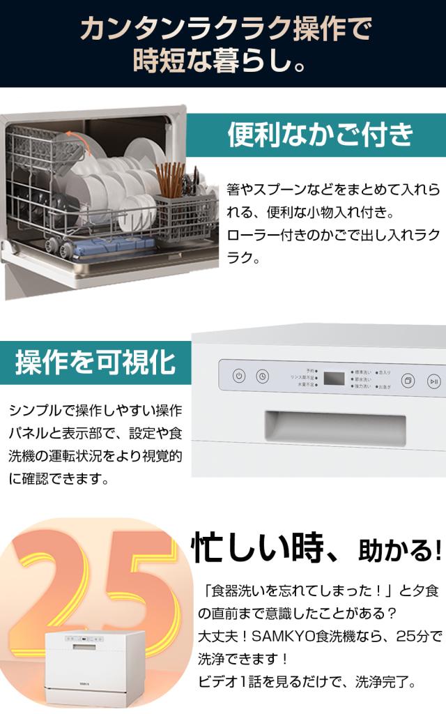 ●ホースを繋ぐだけで使える:食洗機と言うと、「工事必要」「キッチンに置けないといけない」「狭いキッチンや賃貸住宅では場所に困る」…このような印象がよくあります。SAMKYO卓上型食洗機はそれまでの考えを根本から変え、工事不要で届いたその日からすぐに使えます。