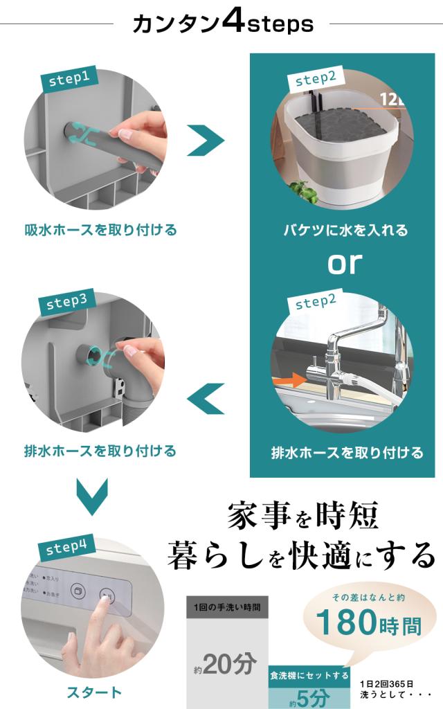 ●どこでも置ける:バケツAから給水・バケツBに排水する場合は、食洗機をリビングやダイニングテーブル、バルコニー…どこでも自由に置けます。