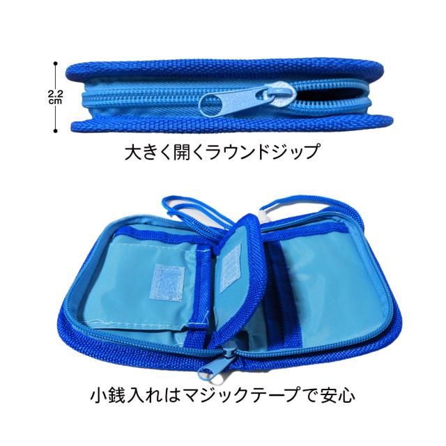 ●大きく開くラウンドジップと首から下げられるストラップで安心!