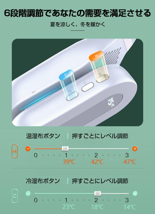 【6段階温度調節】冷却も加熱もお好みの温度で3段階の温度調整が可能です。「COLD」ボタンを押すと冷却モードの3段階温度(約23℃/18℃/14℃)調節ができ、「HOT」ボタンを押すと加熱モードの3段階温度(約39℃/42℃/47℃)調節もできます。また、LEDスクリーンを搭載しているので、温度と電池残量が一目瞭然です。