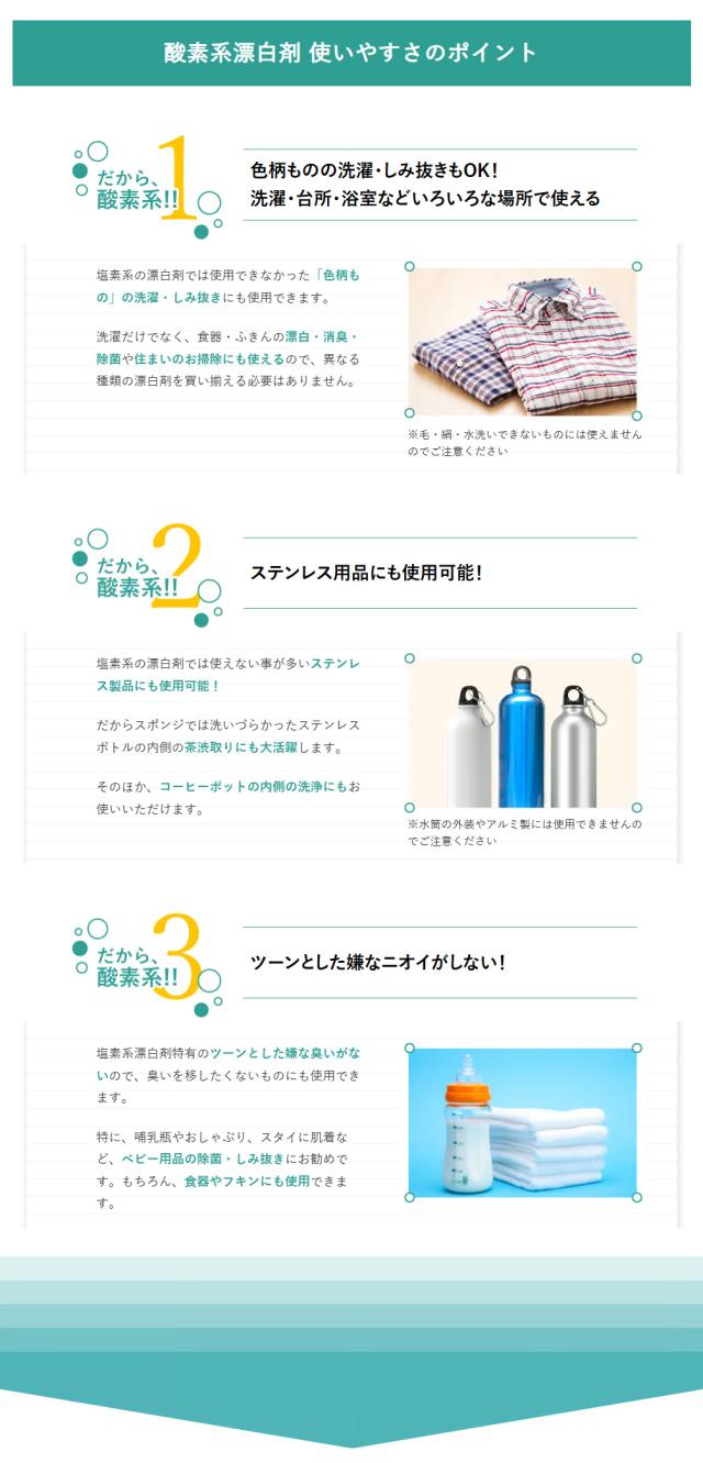酸素系なので色柄もののお洗濯にもご使用いただけます。