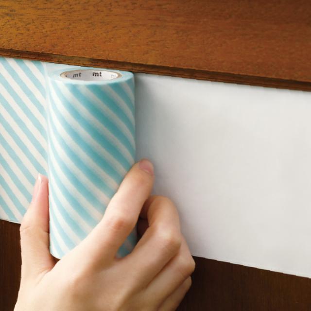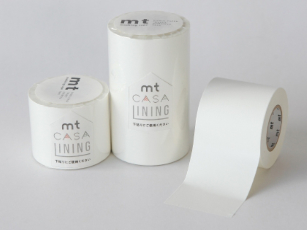 mt CASA LININGは、mt CASAシリーズのマスキングテープを貼る際に、下地が透けるのを防ぐ下貼り用テープです。濃い色の家具や壁、床をテープでアレンジしたいときに、白いペンキを塗るように貼るだけで下地をカバーすることができます。塗装よりも手軽に、上から貼るテープの色柄を発色良く引き出します。
