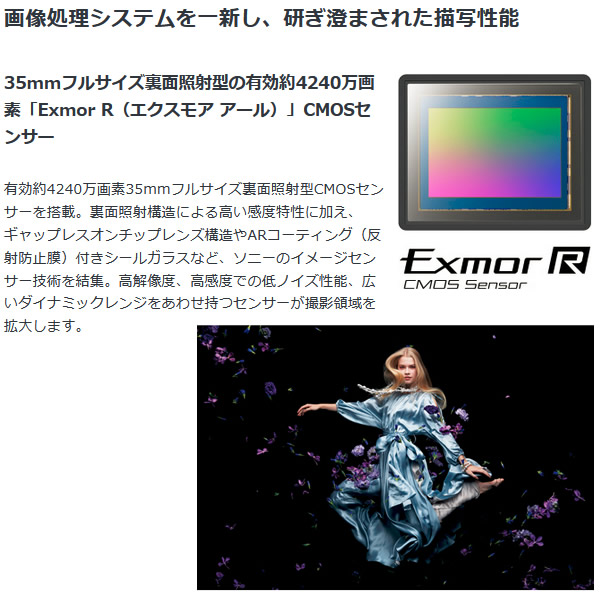 | 撮像素子 | 35mmフルサイズ (35.9 x 24.0mm)、Exmor R CMOSセンサー |