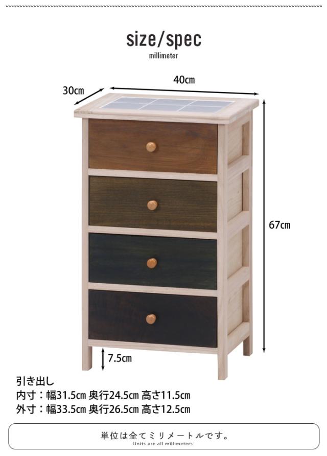 ウッドチェスト 幅40cm チェスト 4段 木製 完成品 脚付き カラフル グラデーション スリム 桐 収納家具 天板タイル キッチン リビング 収納 天然木 ナチュラル カントリー 北欧 おしゃれ リビングボード サイドボード 新生活 一人暮らし
