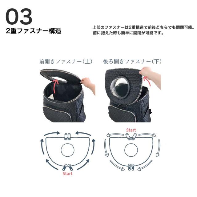 便利な二重ファスナーで前後どちらからでも開閉可能。