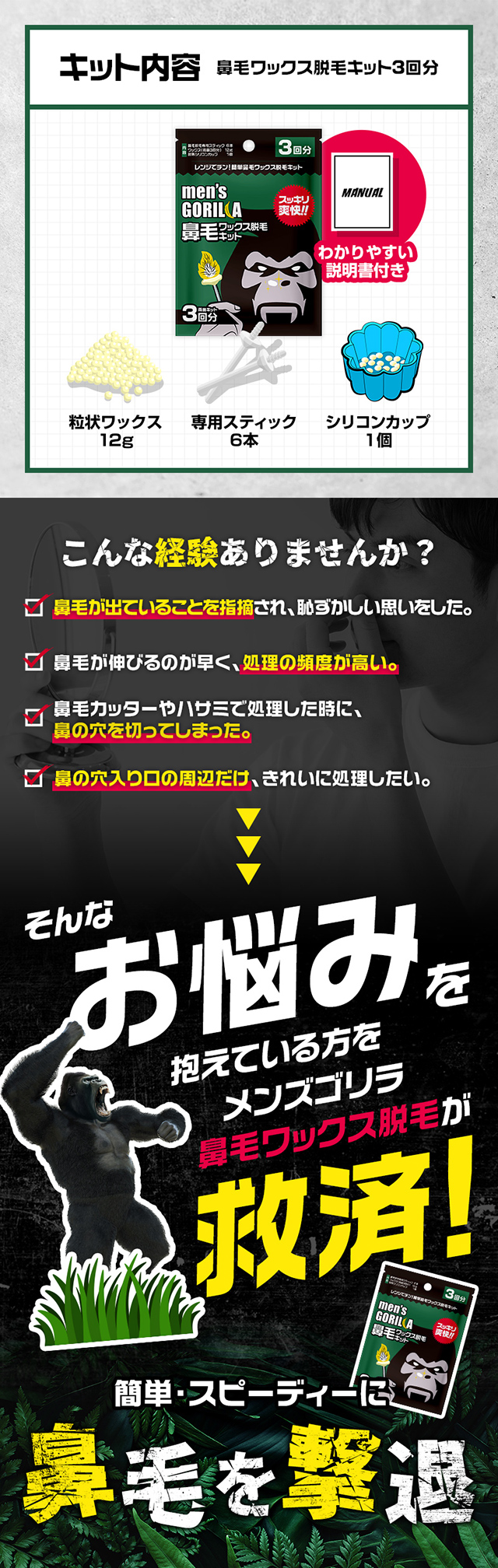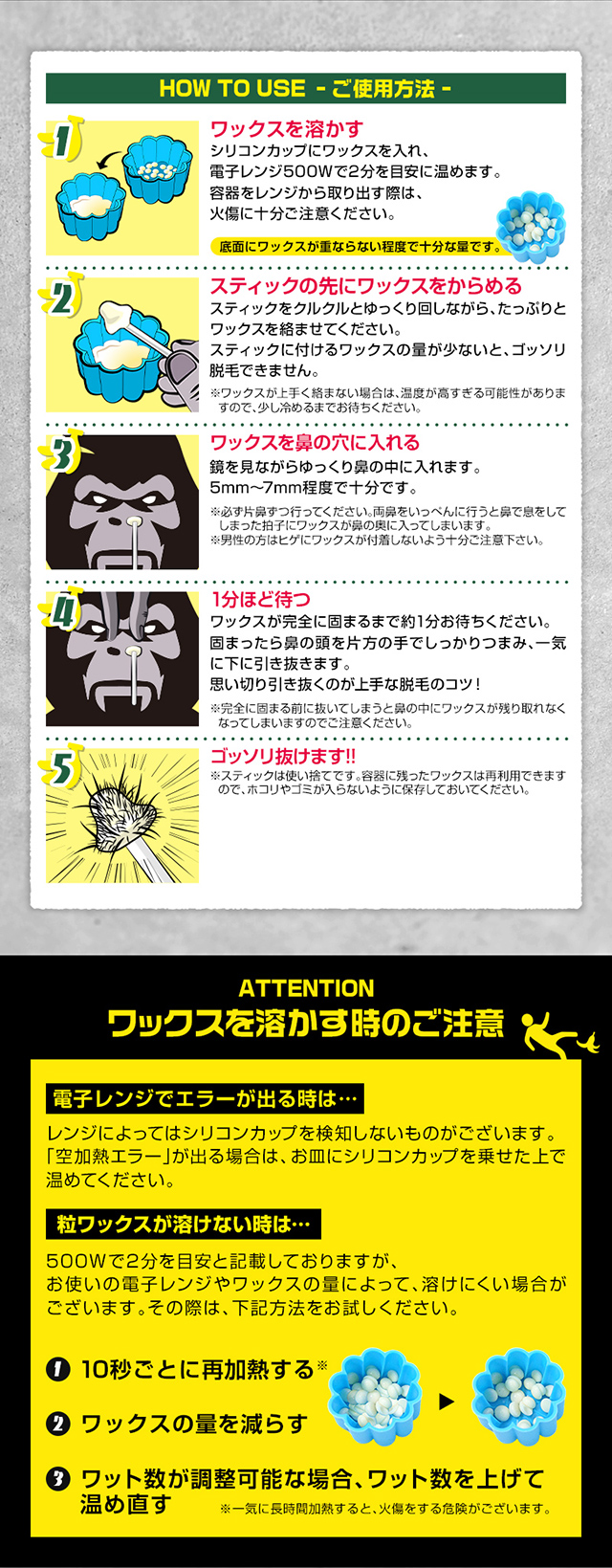 | キット内容 | ・ワックス12g(両鼻3回分) ・耐熱シリコンカップ1個 ・鼻毛ワックス脱毛専用スティック 6本 |