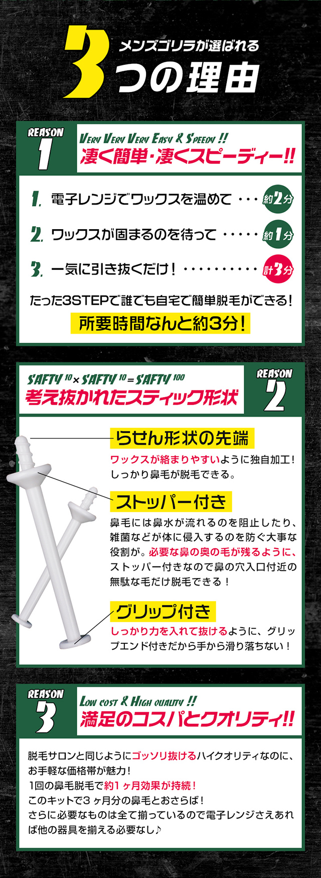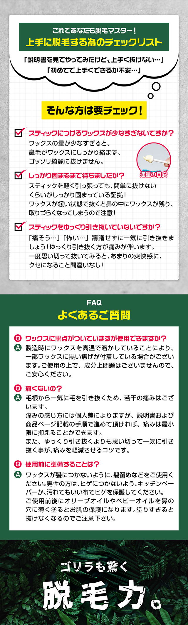 - 息子用に購入したんですが初めてのワックス脱毛で痛いんじゃないかとビクビクしてやってましたが思ったより痛くなかったみたいで良かったです笑