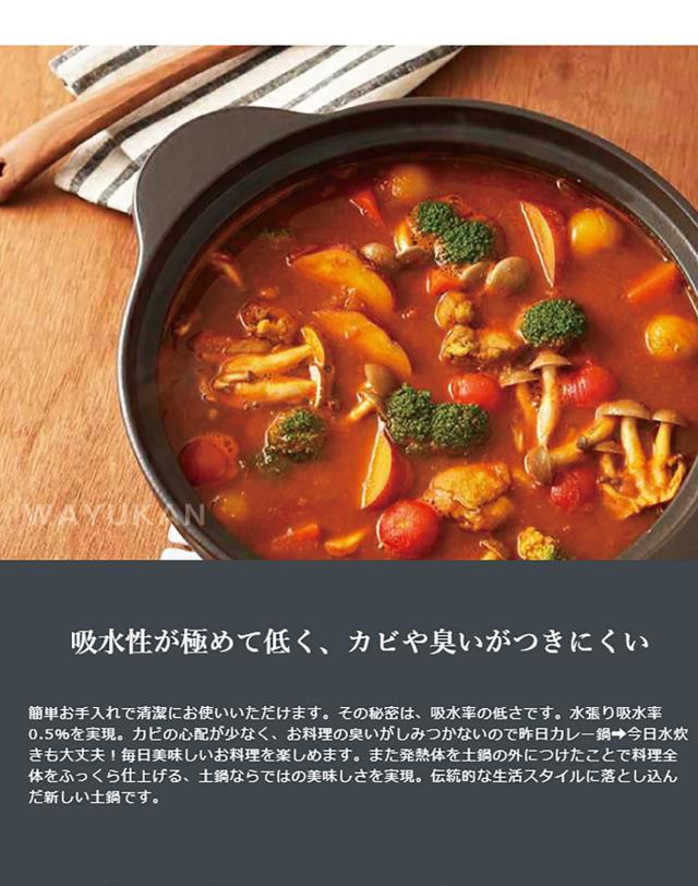 ガラス質によって守られている多層構造の発熱体が土鍋本体に直接焼き付けられているので土鍋に 熱が伝わり、中の食材を心から温めふっくら仕上げる、土鍋本来の味わいを引き出します。また、一般的にIH調理器のトップ面と土鍋の底面が接していないと熱が伝わりにくいとされていますが、 幅射熱によるIH調理器へのダメージ軽減のため、数ミリ隙間をあけても充分に発熱するように 開発された独自の発熱体を使用。調理器にもやさしい土鍋です。