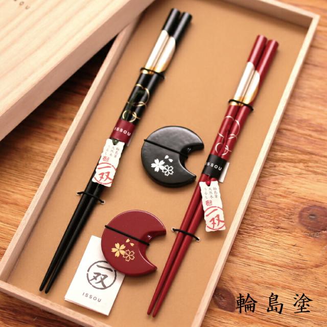 輪島箸 宵待月&箸置華桜ペア おしゃれ セット 日本製 父の日 敬老の日 ギフト 一双 母の日 結婚祝 夫婦箸 還暦祝 誕生日プレゼント【伝統工芸・ 陶器の和遊感】