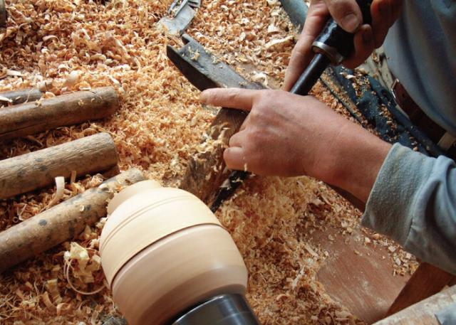 白木地を鉋と呼ばれる特殊な刃物で回転させながらくりぬく轆轤挽きに優れ、主に椀銘々皿、茶托などの丸物の製造を得意とします。特に棗などの茶道具の木地は全国の8割から9割を山中で挽いています。 山中の挽物を特徴づけている筋挽きは木地に鉋で挽目を施し、一種の意匠とするもので、糸目筋、ろくろ筋、びり筋、平みぞ筋、稲穂筋、柄筋など約五十種類あります。豊富な木地の材料に恵まれた山中塗は欅、桜、栃などの材料を大小様々な器物に用いて用途に応じて下地〜塗〜蒔絵の行程へと進み、美しい色つやの漆器が完成致します。
