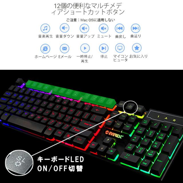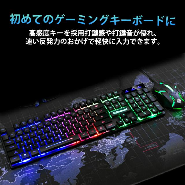 | USBプラグアンドプレイで、しっかり押し込めるキーで扱いやすい。有線ゲーミングキーボードとマウスのセット商品です。 ホワイトではレーザー印字を採用しはっきりと見やすく、ブラックではUV塗装を施しています。 上下左右キーなど遊び心溢れるデザインに。LEDレインボーバックライトのON/OFFや、アンチゴースト機能搭載。 |
