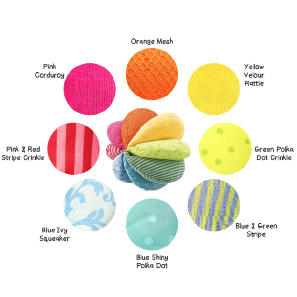 レインボーカラーのボールは、パーツごとに異なる模様と素材を使用しています。