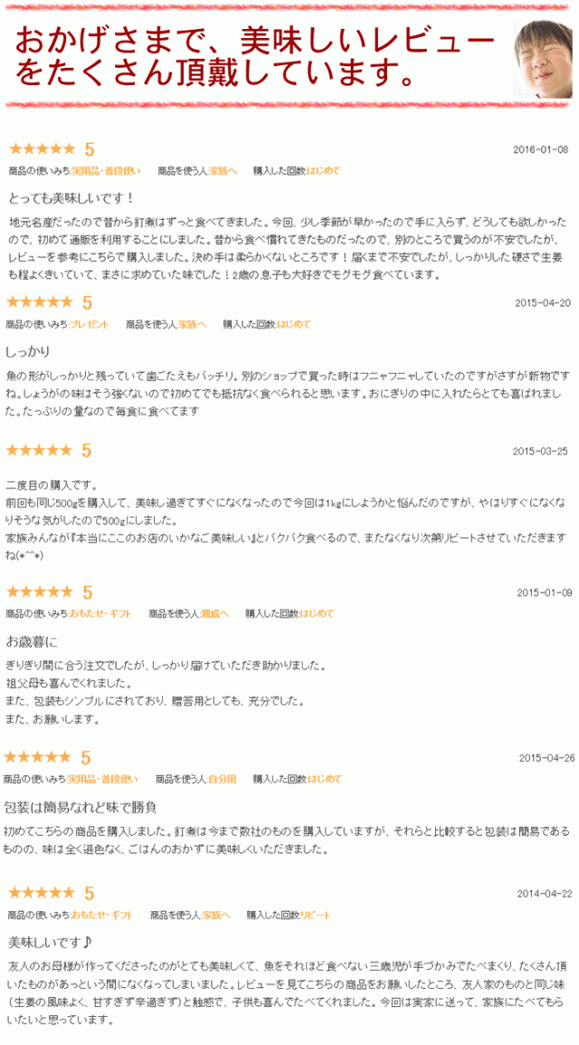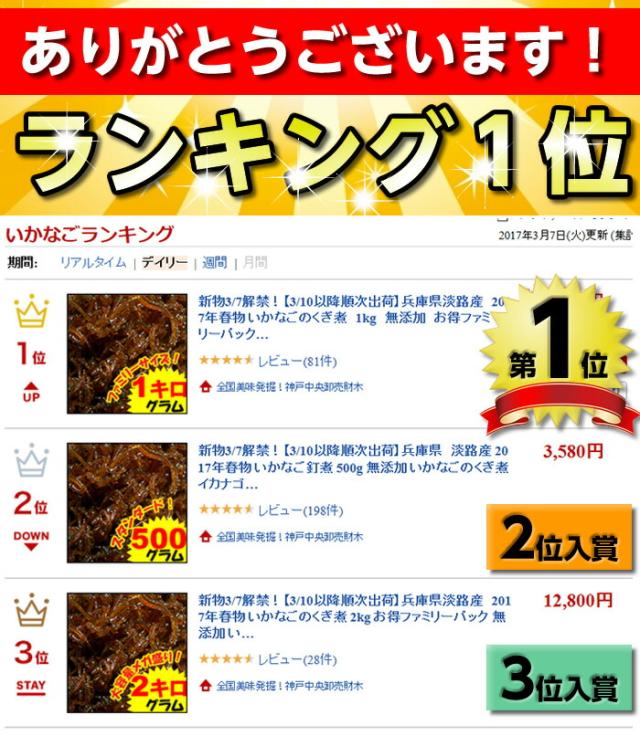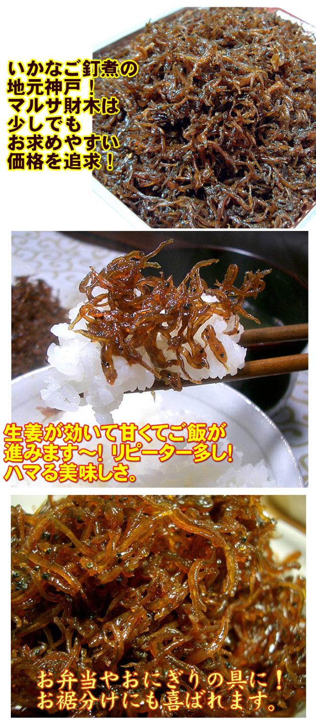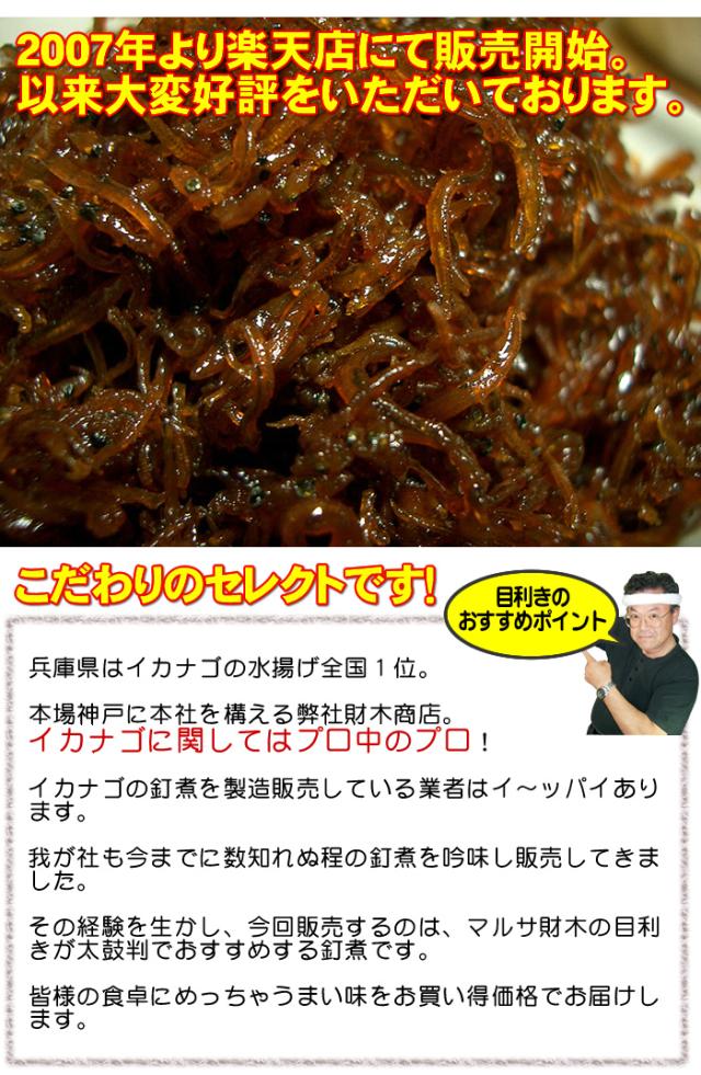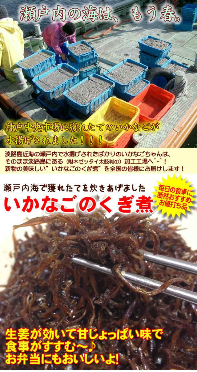 | ★瀬戸内に春を告げる魚!イカナゴ★ 美味しいくぎ煮の季節の始まり(^^) しょうがが少し効いた 甘い味のくぎ煮は 食がついついすすみますぅ〜 待ちに待った、瀬戸内のイカナゴの新子漁が解禁となりました!! 美味しい釘煮の季節の始まりです(^^) 我が兵庫県はイカナゴの水揚げ全国1位。 本場神戸に本社を構える財木商店。 イカナゴに関してはプロ中のプロです! このあたりにはイカナゴの釘煮を製造販売している業者は イ〜ッパイあります。 我が社も今までに数知れぬ程の釘煮を吟味し 販売してきました。その経験を生かし、 皆様の食卓にめっちゃうまい味を お買い得価格でお届けします。