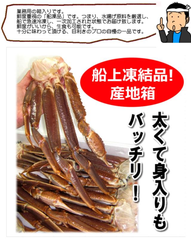 | 目利きが本当にオススメしたい蟹はこれだ!! ズワイガニの中でも特大サイズの生ズワイガニです。合計5kgの大ボリュームです。 5kgのパーティーサイズです。約12-14肩前後ですが、ばらつきあります。 10人〜12人でも十分ご満足いただけるボリュームです。 業務用の箱入りで、品質・価格ともに納得の一品です。 ワンフローズンでお届け致します。 鮮度重視の「船凍品」です。つまり、水揚げ原料を厳選し、船で急速冷凍し、一次加工された状態でお届け致します。 産地で加工されてから、解凍を一切せず、ワンフローズンでお届けできるから、おいしさが違います。(外装箱は産地原料箱となります) カニの加工会社は、この原料箱を仕入れて、さらに加工を行い、化粧箱などにセットします。その都度、解凍・冷凍を繰り返すことで、カニの品質や旨みが落ちてきます。 こちらの商品は、原料箱のままお届け致しますので、みずみずしさや美味しさが違います。 鮮度がいいです。当店スタッフは生でパクパク食べてました(基本は過熱用ですが)。 生ですので、お鍋にも、焼きガニ、バター焼き、カニ飯・・・。おいしさの幅が広がります。