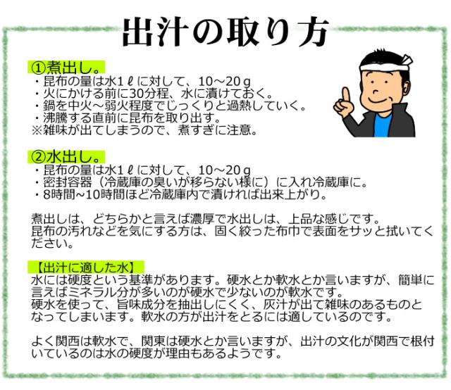 | オススメの食べ方 高級だし昆布として用いられる『羅臼昆布』。 その羅臼昆布の耳の部分の出汁昆布で、濃厚で香りの良い良質の出汁がとれます。 耳というのは、昆布の真ん中部分ではなく、周りの部分のことを言います。 昆布を成形する際に耳の部分は切り落とされます、真ん中の部分は厚みもあり非常に高値で取引されますが、切り落とされた耳の部分は中心に比べ安価で厚みも薄いです。でも、この耳の部分がとっても良い出汁が出るんですよ♪ 中心の高い部分より、出汁が出るんじゃないかと思うほどで我が家でも欠かせない存在です。 出汁を取った後の昆布は捨てずに佃煮とかに炊いて食べると美味しいですよ。 昆布は炊き込むとフンワリと柔らかく非常に美味になりますので試してみてください。 |