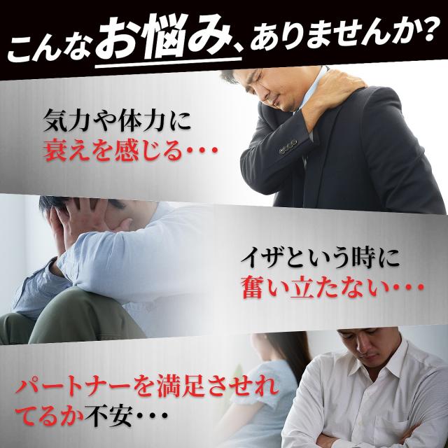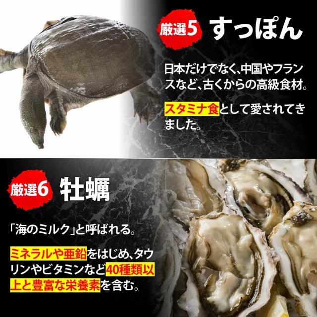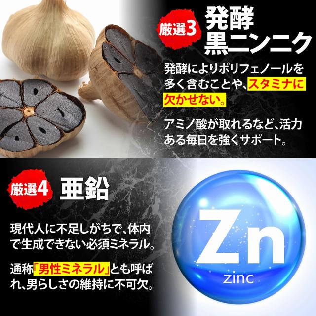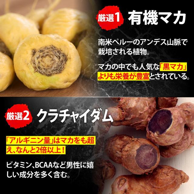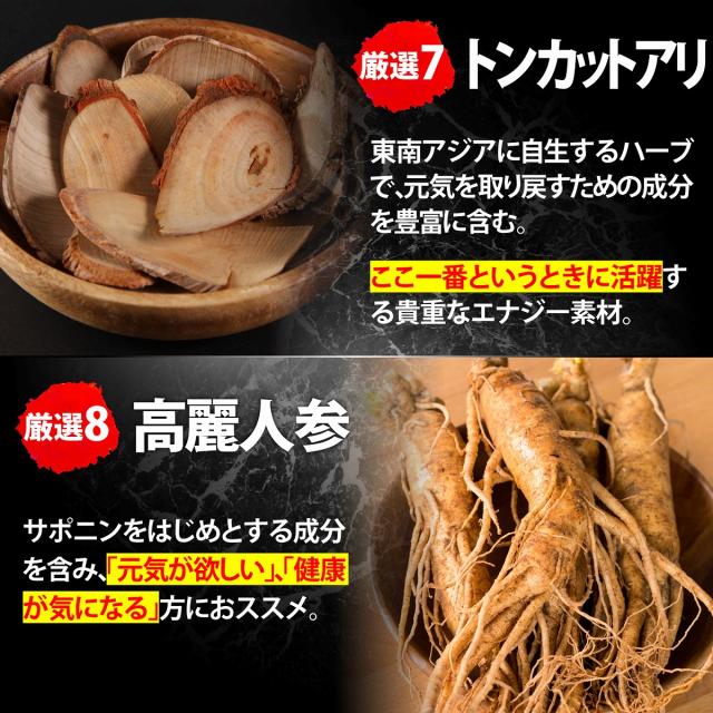 有機マカ、クラチャイダム、発酵黒ニンニク、高麗人参、トンカットアリ、すっぽん、亜鉛、牡蠣
