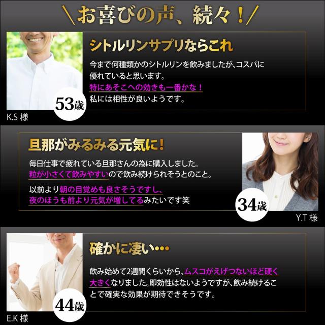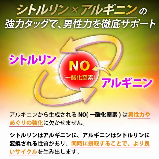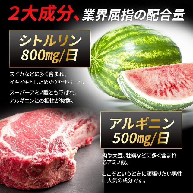 厳選成分10種:L-シトルリン、亜鉛酵母末、マカ(有機)末、黒生姜末、カキ肉エキス末、トンカットアリエキス末、高麗人参末、醗酵黒ニンニク末、スッポン末、L-アルギニン